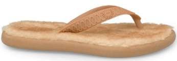 UGG(R) Australia mixes it up with the cushy Fluffie flip flop sandal. Classic rubber flip-flop upper in a casual thong sandal style with a rolled rubber toe thong post and printed sun logo embellishment. Smooth rubber lining and plush, cushioning sheepskin fleece topped footbed. Flexible, shock-absorbing midsole. Traction patterned TPR outsole.